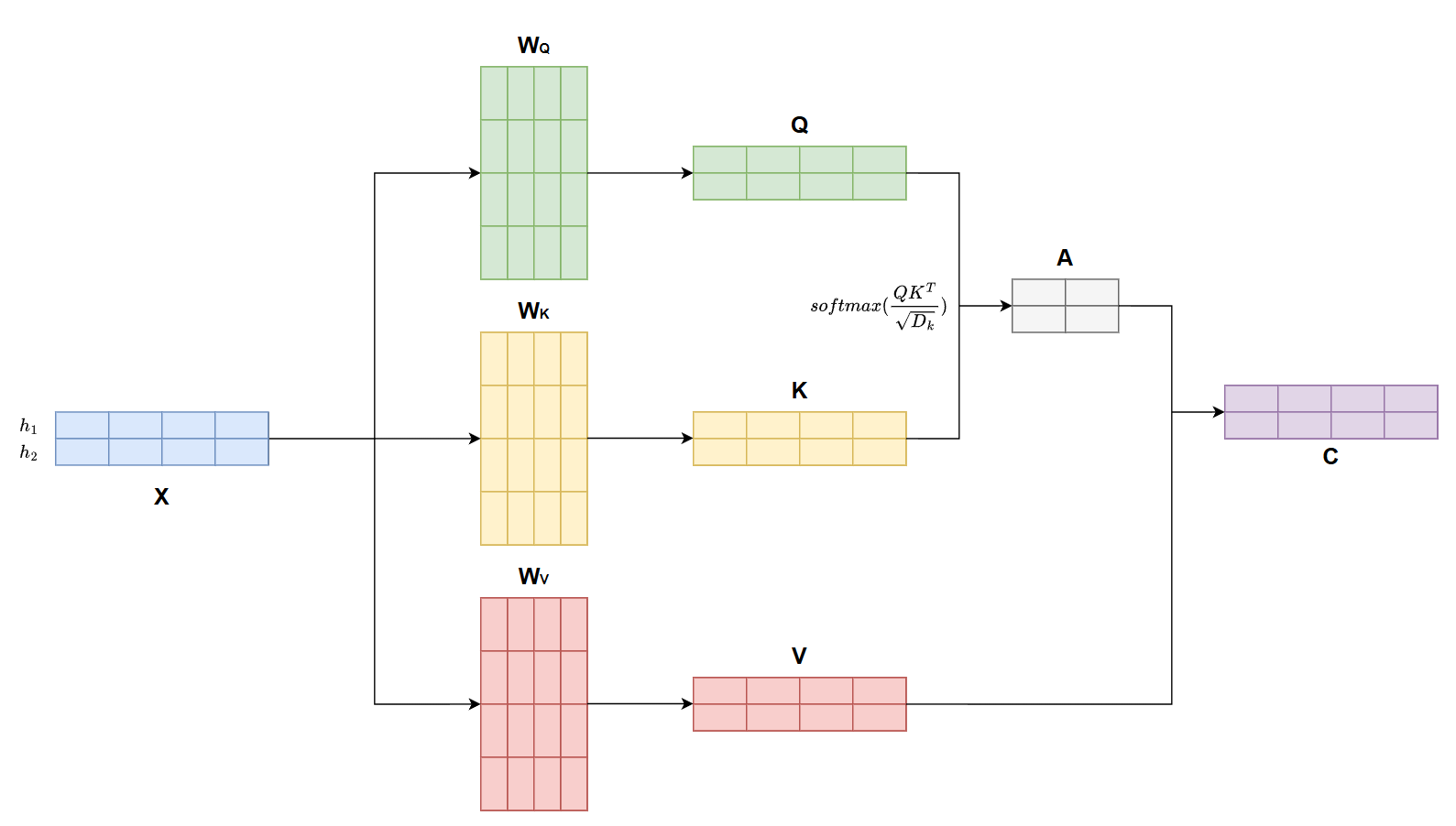 C \in \R^{L \times D_k}: 注意力结果矩阵