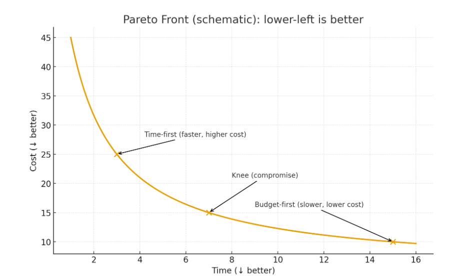 理由:在这点之前,花钱能明显换来速度;再往左压时间时,一小点提速要付出很大代价,不再划算。膝点就是“性价比最高的转折”。
