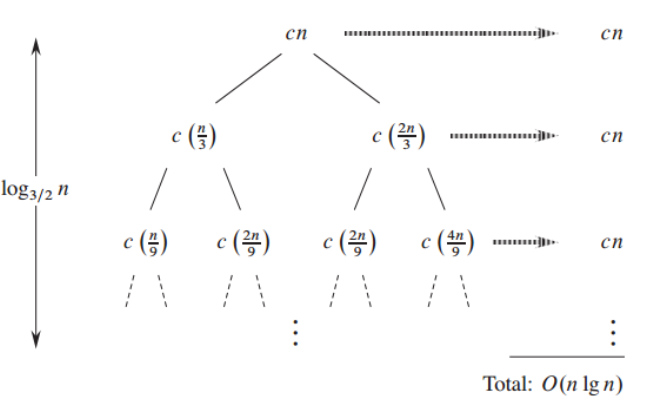 每一层把规模 n分成 \frac n 3和 \frac {2n} 3。从根到叶的最长路径总是走“更大的那支” \frac {2n} 3: